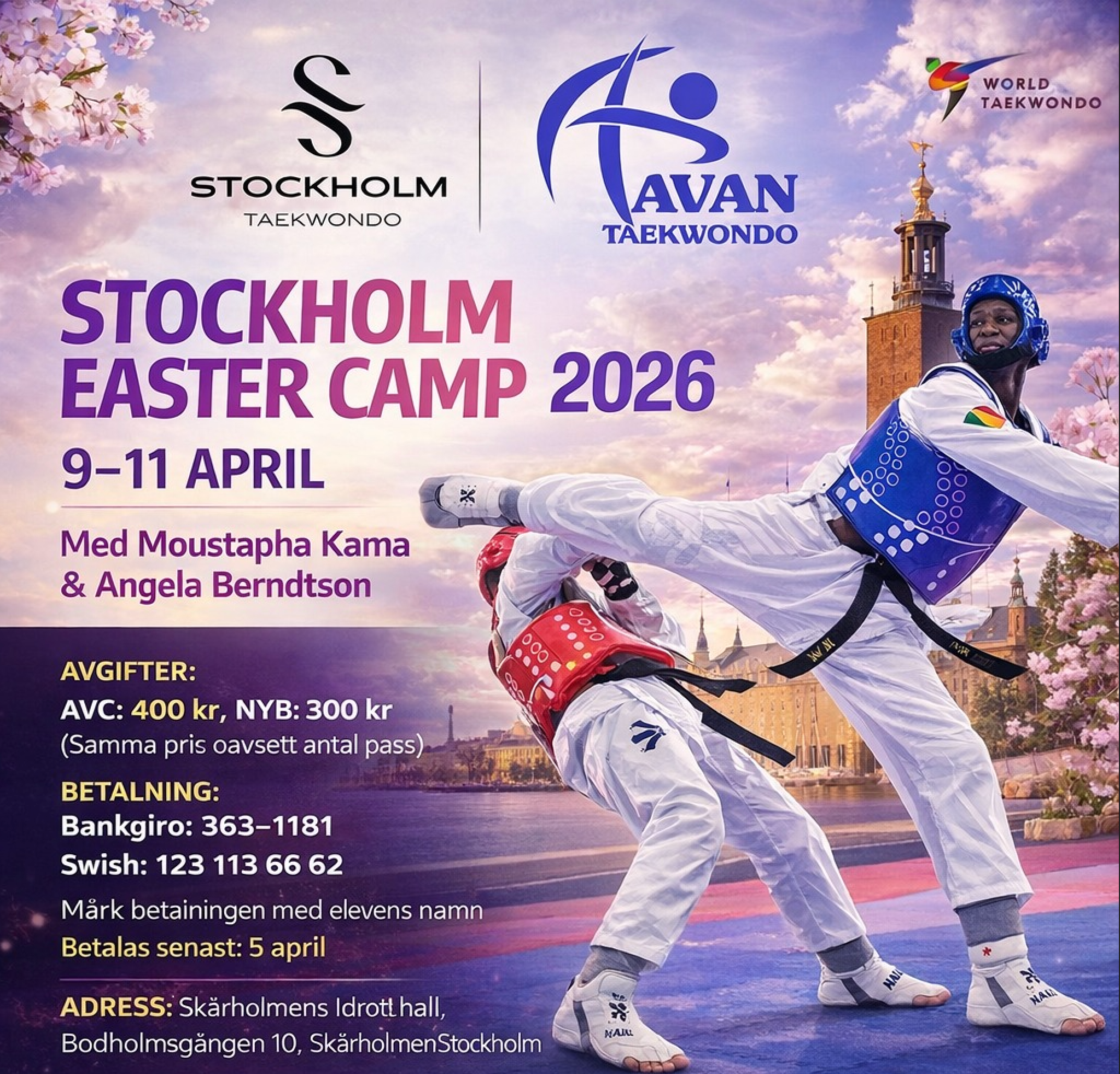 Välkommen till Stockholm Easter Camp 2026 – ett intensivt och inspirerande taekwondoläger med fokus på Poomsae (teknik) och Kyorugi (sparring). Under tre dagar, 9–11 april, får deltagare på alla nivåer möjlighet att utveckla sina färdigheter och träna tillsammans med erfarna instruktörer Moustapha Kama och Angela Berndtson. Lägret hålls i Skärholmens Idrottshall och erbjuder en perfekt möjlighet att förbättra teknik, förbereda sig för tävling och träna i en motiverande miljö tillsammans med andra utövare.